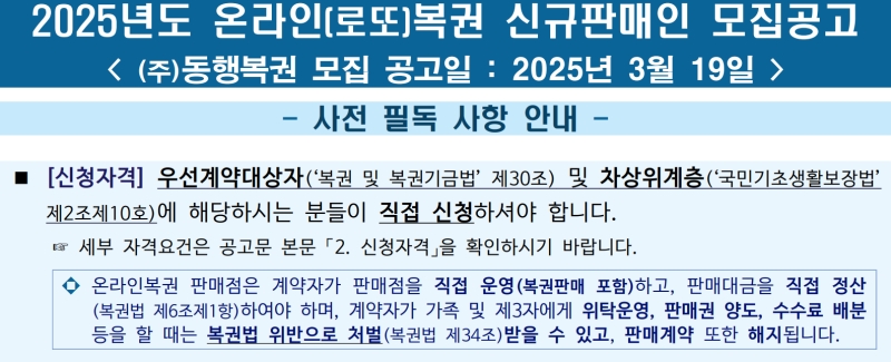5. 공고 상세 페이지로 들어오면 모집에 대한 구체적인 내용을 볼 수 있습니다. 첨부된 '2025년 온라인복권 신규판매인 모집공고.pdf' 파일을 통해 전체 내용을 확인해야 합니다.