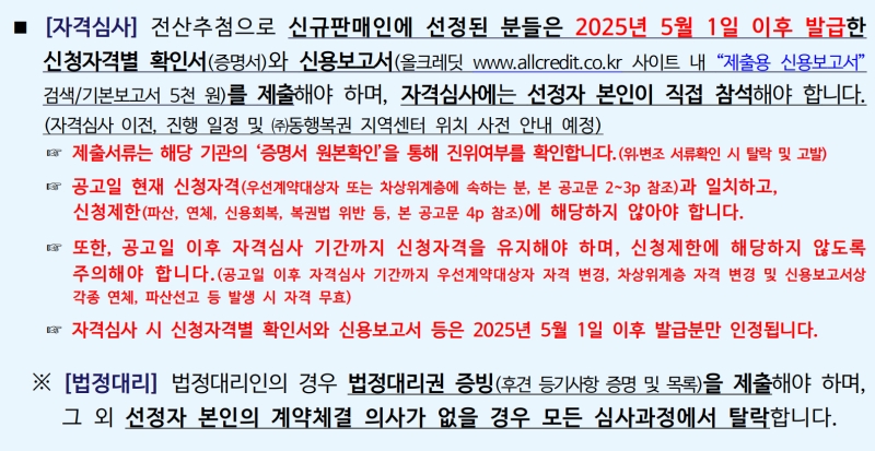8. 전산추첨으로 선정된 이후에는 자격 심사를 거치게 됩니다. 2025년 5월 1일 이후 발급된 신청자격별 확인서와 신용보고서를 반드시 제출해야 합니다.