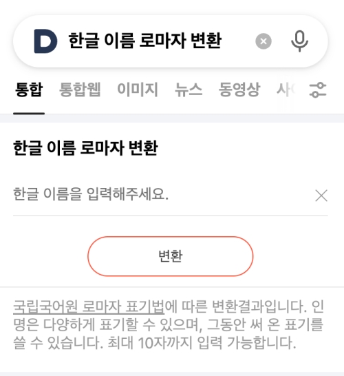 2. 인터넷 검색창 '다음'에서 '한글 이름 로마자 변환'이라고 검색하면, 누구나 쉽게 사용할 수 있는 변환기가 나옵니다. 따로 프로그램을 설치할 필요가 없어 더욱 편리합니다.