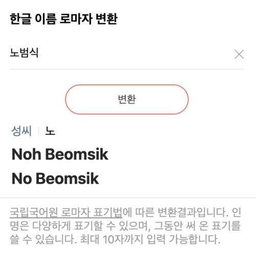 5. 다른 예시로 '노범식'을 검색해 보면 'Noh Beomsik'과 'No Beomsik' 두 가지를 보여줍니다. 'No'는 영어에서 '아니다'라는 부정적인 의미가 강하므로, 성씨임을 명확히 알 수 있는 'Noh'로 표기하는 것이 훨씬 좋습니다.