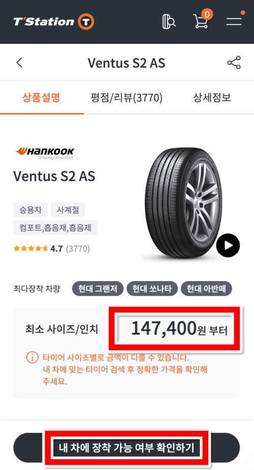 마음에 드는 타이어를 선택하면 상세 정보 페이지로 이동합니다. 저는 많은 분이 선택한 'Ventus S2 AS' 제품을 살펴봤어요. 승차용, 사계절용 같은 기본 정보와 함께 '최소 사이즈/인치'를 기준으로 한 시작 가격이 표시됩니다. 하지만 이건 시작가일 뿐, 내 차에 맞는 정확한 가격을 확인하려면 하단에 있는 '내 차에 장착 가능 여부 확인하기'를 눌러 다음 단계로 넘어가야 합니다.