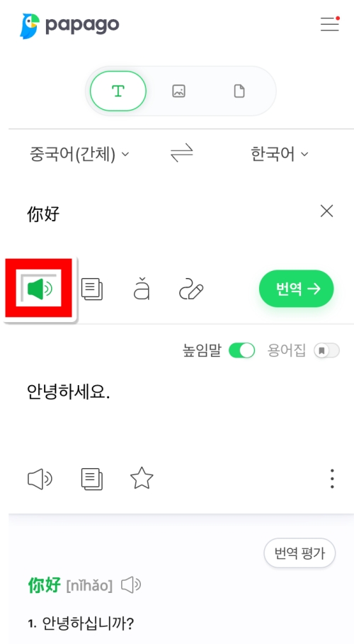 번역된 글자만 봐서는 어떻게 발음해야 할지 알기 어렵잖아요. 그럴 때는 번역 전 원문 아래에 있는 스피커 모양을 눌러보세요. 원어민의 목소리로 정확한 발음을 직접 들려주기 때문에, 글자의 뜻뿐만 아니라 소리까지 함께 익힐 수 있어서 어학 공부에도 큰 도움이 되더라고요.