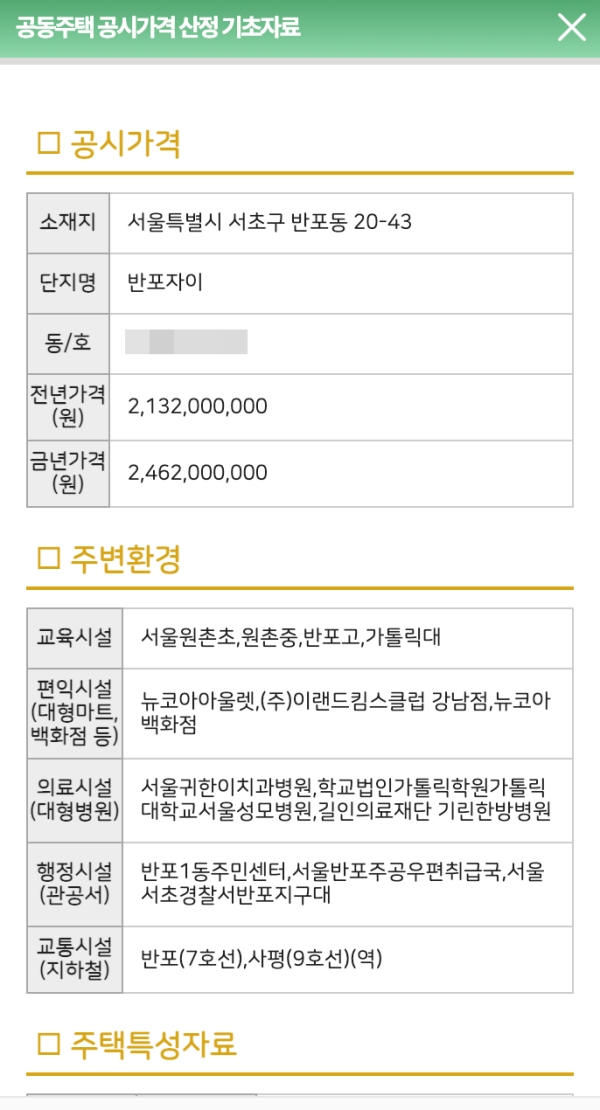 단순히 가격만 알려주는 게 아니라, 이 가격이 어떻게 산정되었는지 기초 자료도 볼 수 있었어요. '산정기초자료 보기'를 누르니 주변 환경에 대한 정보, 예를 들어 교육, 편의, 의료, 교통 시설 등이 상세하게 나와 있었어요. 이런 정보들까지 함께 보니 가격에 대한 이해도가 더 높아지는 기분이었어요.