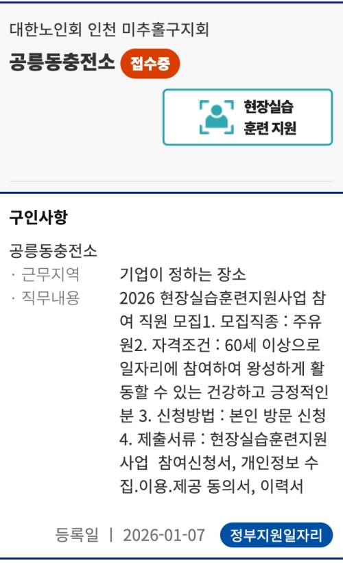 공고 제목을 선택해서 들어오시면 '구인사항'이라는 항목에서 근무하게 될 장소나 주요 업무 내용, 그리고 어떤 자격 조건을 가진 분을 모집하는지 상세하게 확인할 수 있어요. 다른 무엇보다 '자격조건' 부분은 꼼꼼하게 읽어보는 게 좋아요. 보통 '60세 이상'처럼 나이 조건이 있는 경우가 많아서, 이 부분을 놓치면 나중에 신청하고도 안 될 수 있거든요. 필요한 서류도 미리 확인해두면 준비하기 편하겠죠.