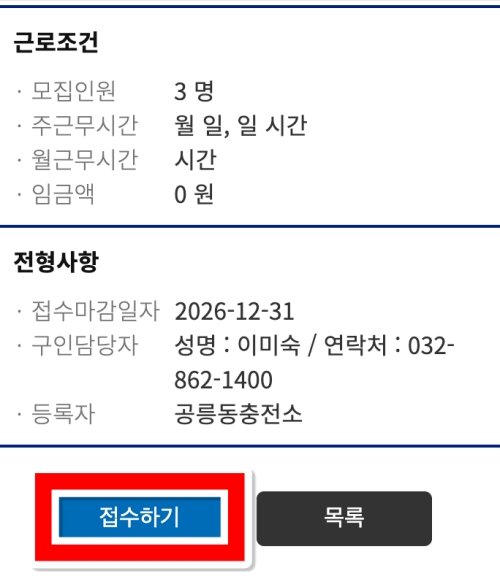 상세 내용을 쭉 확인하고 화면을 아래로 더 내리면 모집 인원, 근무 시간, 급여 등 '근로조건'과 접수 마감일 같은 '전형사항'을 마저 볼 수 있어요. 모든 내용을 살펴보고 이 일자리에 지원해보고 싶다는 생각이 들면, 마지막으로 화면 하단에 있는 파란색 '접수하기' 버튼을 통해 신청할 수 있습니다.