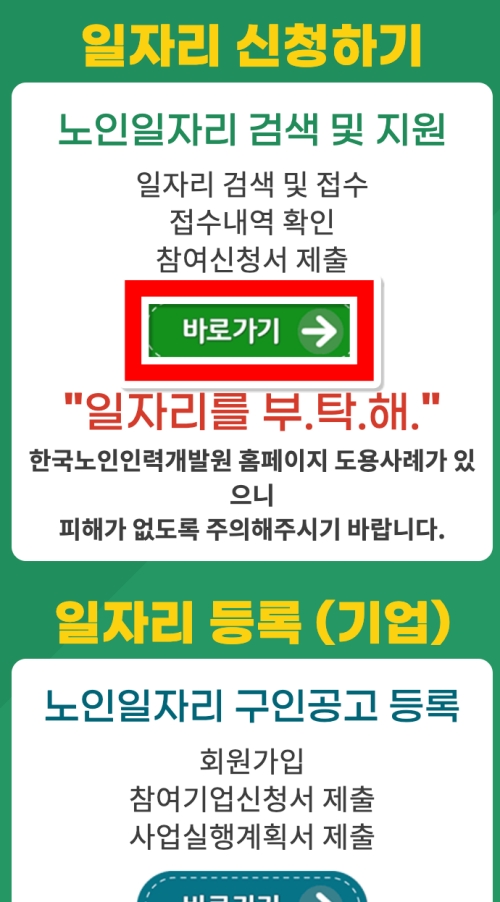홈페이지에 들어서면 여러 가지 안내 문구들이 보이는데요, 우리는 일자리를 직접 찾아보고 신청할 거니까 다른 건 잠시 접어두셔도 괜찮아요. 화면 중간쯤에 보이는 '일자리 신청하기'라는 제목 아래에 있는 초록색 바로가기로 들어가시면 된답니다. 기업 회원으로 구인 공고를 올리는 게 아니라면 이쪽으로 들어가는 게 맞아요.
