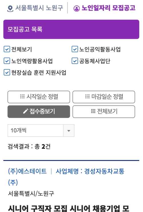 지역 선택을 마치면 드디어 해당 동네에서 현재 모집 중인 일자리 목록이 화면에 나타나요. 화면 위쪽을 보면 '전체보기'를 포함해 '노인공익활동사업', '공동체사업단' 등 여러 가지 사업 유형이 보이는데요. 이걸 활용하면 내가 원하는 종류의 일자리만 따로 골라서 볼 수 있어서 편리해요. 처음에는 어떤 종류가 있는지 잘 모르니 우선 전체 목록을 한번 훑어보는 것도 좋은 방법이에요.