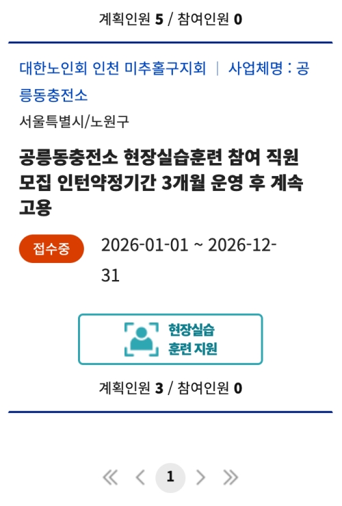 목록을 살펴보면 각 공고의 사업명과 모집 기간, 그리고 어떤 종류의 활동인지 간단한 정보가 나와 있어요. 특히 '접수중'이라는 주황색 표시가 있어서 지금 바로 신청할 수 있는 자리인지 한눈에 알 수 있어 좋았어요. 여러 공고 중에서 관심이 가는 일자리가 있다면, 그 공고의 제목 부분을 선택해 어떤 일을 하는지, 조건은 어떤지 등 더 자세한 내용을 확인할 수 있습니다.