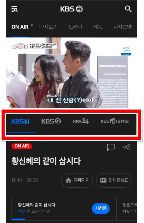 '온에어'로 들어오면 바로 현재 방송 중인 화면이 보일 거예요. 보통은 KBS1 채널이 기본으로 설정되어 있더라고요. 화면 아래를 보면 KBS1, KBS2처럼 여러 채널 이름이 가로로 나열되어 있어요. 여기서 보고 싶은 채널을 선택하기만 하면 화면이 바로 바뀌어요. 저는 지금 방송 중인 '황신혜의 같이 삽시다'가 재미있어 보여서 잠시 시청했어요.