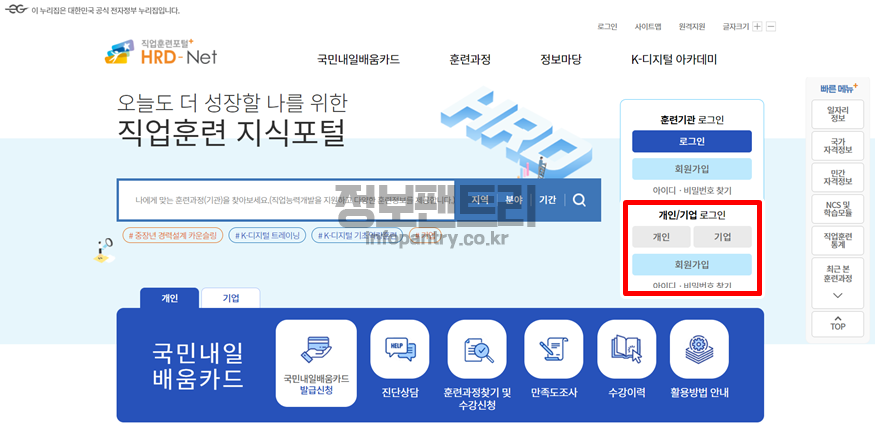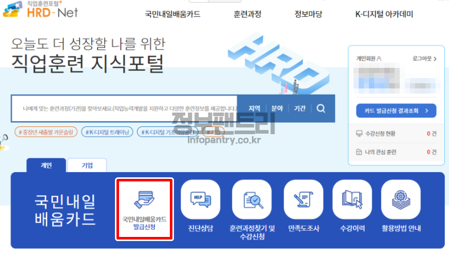 고용노동부에서 운영하는 직업훈련포털 HRD-Net 에 접속해주세요.