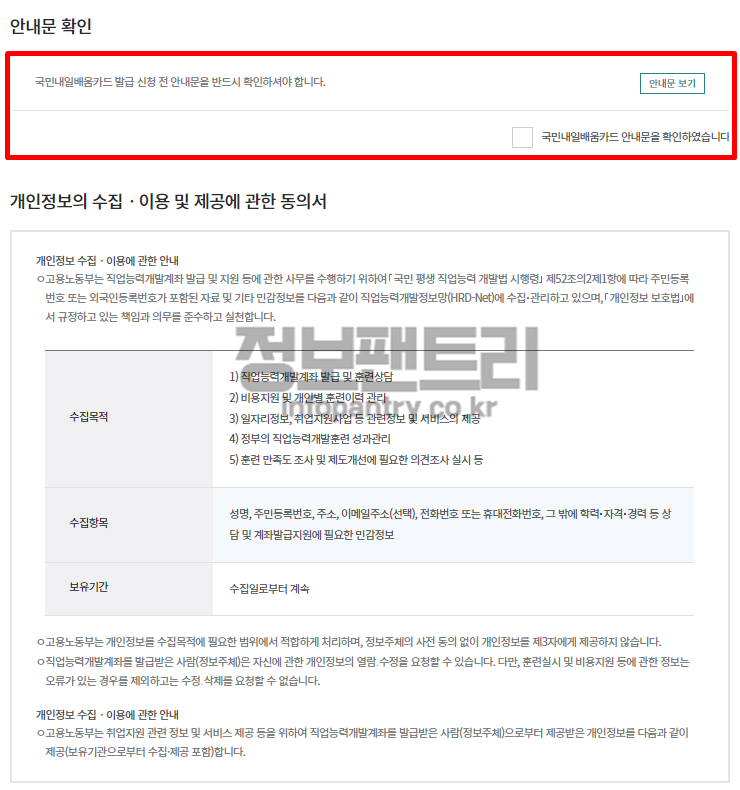 마지막 행정정보 공동이용 동의에 체크해주시고 발급신청 버튼을 누르면 국민내일배움카드 신청이 완료됩니다. ^^