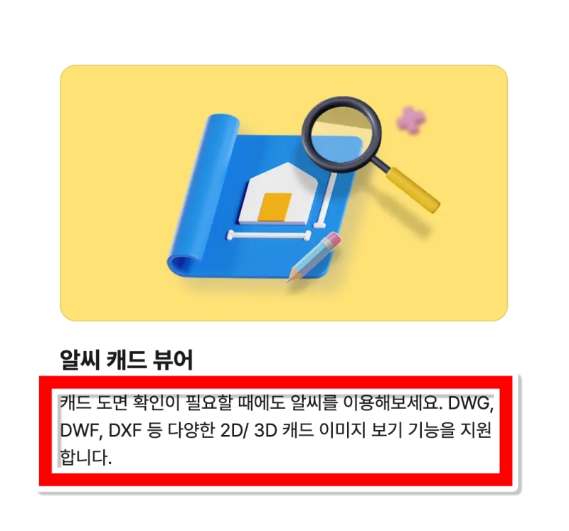 설치를 진행하면서 알씨가 어떤 유용한 점이 있는지 조금 더 살펴볼게요. 페이지를 아래로 내려보면 알씨 캐드 뷰어에 대한 설명이 있어요. 많은 분들이 알씨를 사진 보는 프로그램으로만 알고 계시지만, 이렇게 DWG, DWF, DXF 같은 다양한 2D, 3D 캐드 도면을 확인하는 기능도 갖추고 있답니다. 이 기능 덕분에 무거운 전문 프로그램이 없어도 도면을 쉽게 열 수 있는 거죠.