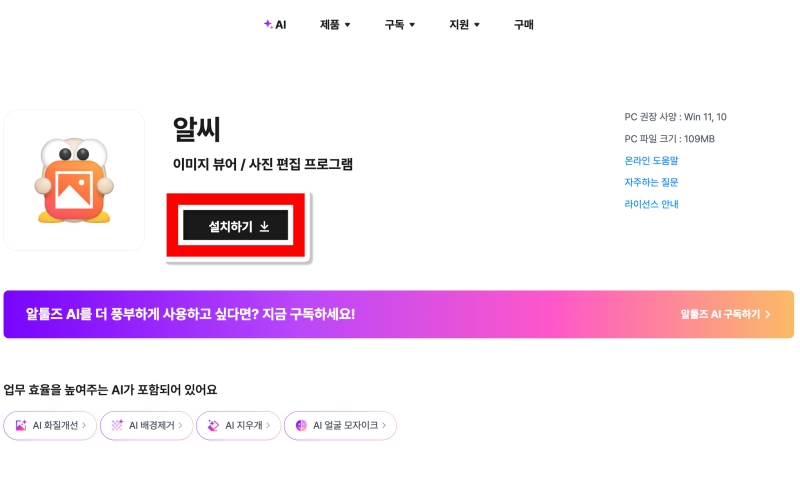 이제 알씨에 대한 소개 화면으로 넘어왔어요. 바로 프로그램을 내려받을 수 있는 곳이죠. 화면 왼쪽을 보면 프로그램 아이콘과 이름이 있고, 그 바로 아래에 눈에 잘 띄는 검은색 '설치하기' 버튼이 있어요. 이 버튼을 선택하면 설치 파일이 컴퓨터로 저장되기 시작해요. 오른쪽에는 PC 권장 사양이나 파일 크기 같은 정보도 나와 있으니 한번 훑어보는 것도 좋답니다.