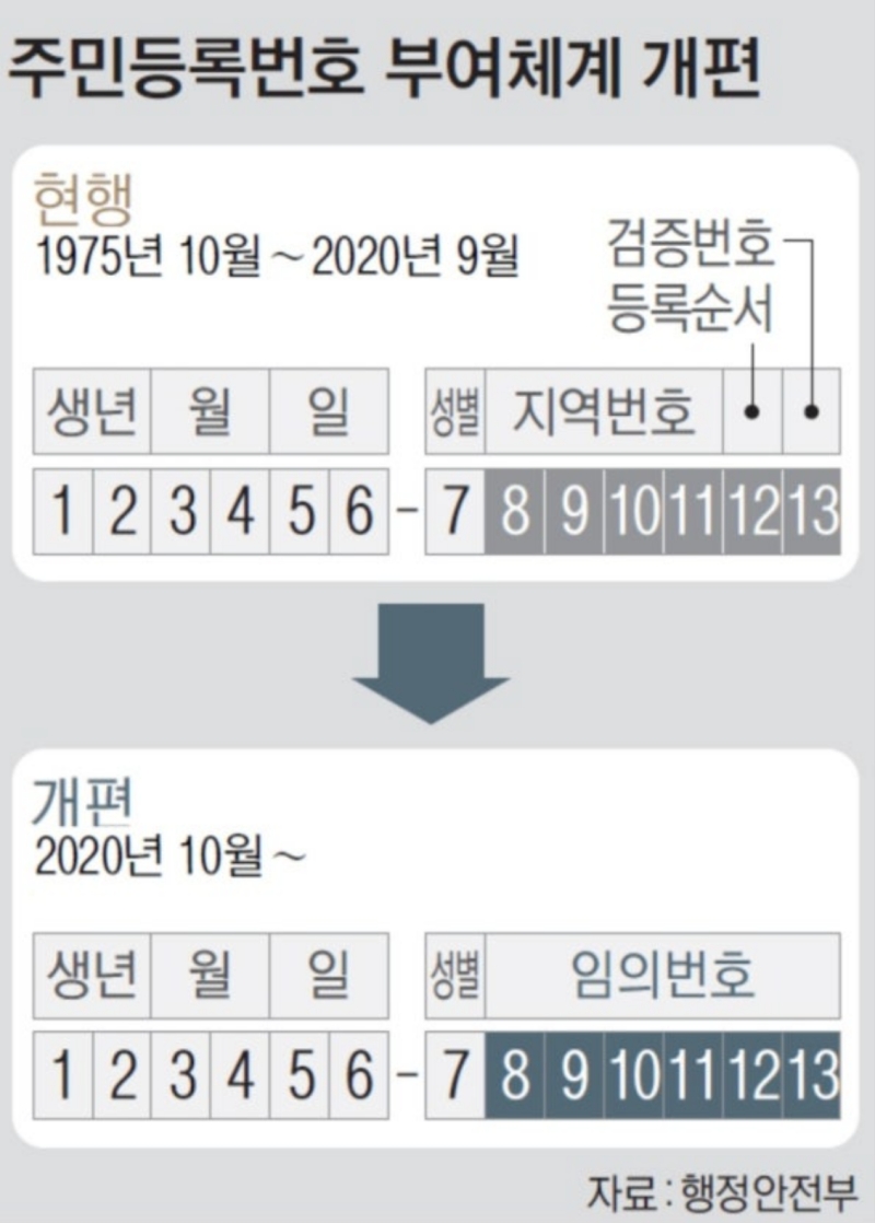 이런 개인정보 노출 문제를 해결하기 위해 2020년 10월부터 주민등록번호 부여 체계가 바뀌었어요. 1975년부터 약 45년간 유지되던 지역번호 시스템이 사라진 건데요. 2020년 10월 이후에 주민등록번호를 새로 발급받거나 변경하는 경우, 성별을 나타내는 7번째 숫자를 제외한 나머지 6자리 숫자는 지역번호 없이 임의의 번호로 채워지게 됐어요. 이제는 뒷자리 번호만 보고 출신 지역을 추측하는 건 불가능해진 셈이죠.