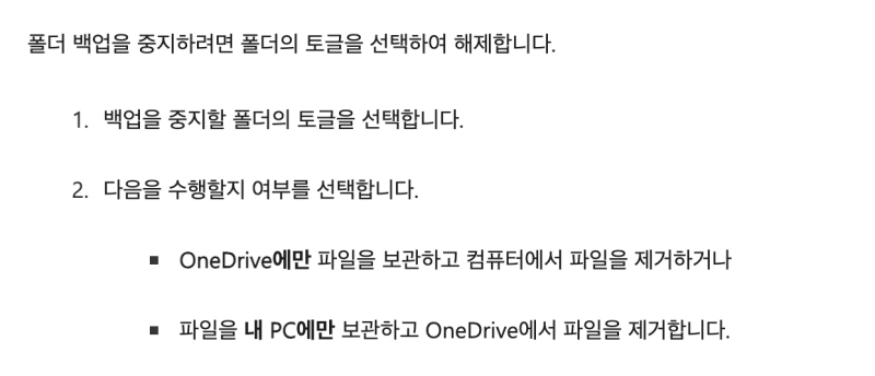 반대로 특정 폴더의 백업을 그만두고 싶을 때도 있겠죠. 다시 '백업 관리' 창으로 들어가서, 백업을 중지하고 싶은 폴더의 스위치를 선택해서 꺼주시면 돼요. 그러면 파일들을 어떻게 처리할지 묻는 창이 나타나는데, 파일을 'OneDrive에만 보관'할지, 아니면 '내 PC에만 보관'할지 선택할 수 있어요. 내 컴퓨터의 용량을 확보하고 싶다면 전자를, 인터넷 연결 없이 파일을 쓰고 싶다면 후자를 선택하면 됩니다.