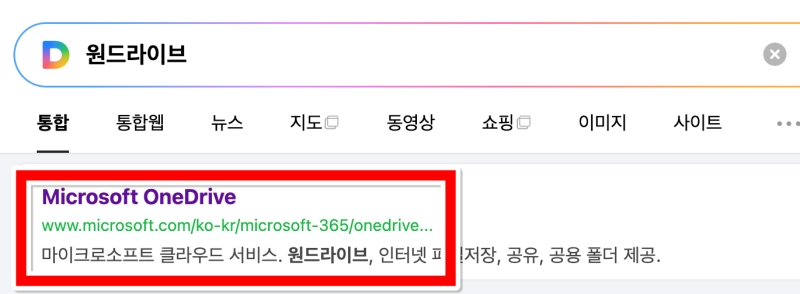 원드라이브를 사용하려면 먼저 프로그램을 설치해야겠죠. 자주 사용하시는 검색 사이트에서 '원드라이브'라고 검색해 주세요. 마이크로소프트 공식 프로그램이다 보니 보통 검색하면 바로 상단에 나와요. 'Microsoft OneDrive' 이름으로 명칭되어 있으니 찾기 쉽습니다.
