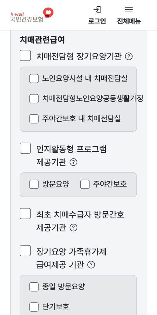 화면을 조금 더 아래로 내려보면 '치매관련급여' 항목이 따로 있어요. 만약 돌봄이 필요한 어르신께서 치매 진단을 받으셨다면 이 부분을 반드시 확인하셔야 해요. 치매 어르신을 전문적으로 돌보는 '치매전담형' 기관이나 '인지활동형 프로그램'을 운영하는 곳들만 따로 필터링해서 볼 수 있거든요. 일반 시설과 다른 전문적인 돌봄이 필요하기 때문에 이 항목은 잊지 말고 꼭 확인해 보세요.