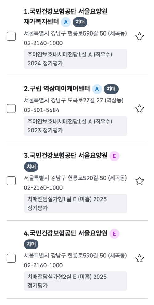 지도 보기가 익숙하지 않다면 상단의 '목록검색' 탭을 선택해서 리스트 형태로 볼 수도 있어요. 저는 개인적으로 목록 보기를 더 자주 이용하는데요. 시설 이름, 주소, 연락처가 깔끔하게 정리되어 있고, 특히 'A(최우수)'처럼 기관 평가 등급이 바로 보여서 여러 곳을 비교하기가 훨씬 편하거든요. 등급이 낮은 곳도 솔직하게 전부 공개되니 오히려 더 믿음이 갔어요.