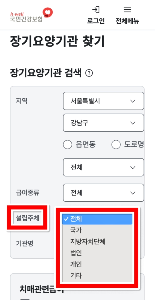 그다음은 '설립주체'를 정할 수 있어요. 이것은 시설을 누가 설립해서 운영하는지를 기준으로 나누는 항목예요. 나라나 지방자치단체에서 직접 운영하는 공공 시설도 있고, 사회복지법인이나 개인이 운영하는 곳도 있죠. 특별히 선호하는 운영 형태가 있다면 여기서 고르면 되고, 그게 아니라면 저처럼 '전체'로 설정하고 다양한 곳을 둘러보는 걸 추천해요.