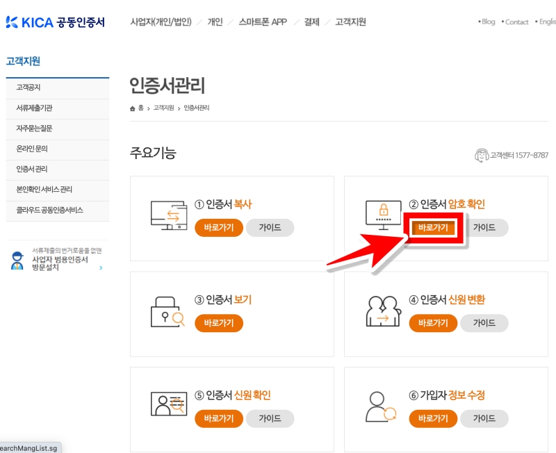 인증서 관리 페이지로 이동하면 여러 기능이 네모난 상자 안에 정리되어 있어요. 우리는 비밀번호가 맞는지 확인하는 것이 첫 번째 목표이니, 오른쪽 상단에 있는 '② 인증서 암호 확인' 바로가기 버튼을 선택합니다.