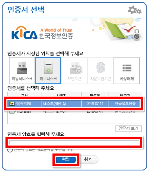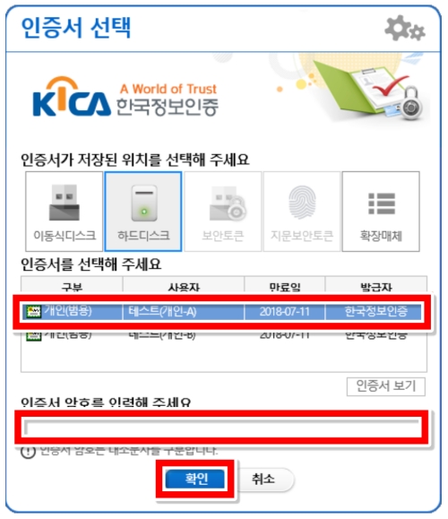 이제 내 컴퓨터에 저장된 인증서를 선택하는 창이 나타나요. 먼저 인증서가 저장된 위치(보통 하드디스크)를 확인하고, 목록에서 본인 인증서를 선택해 주세요. 그다음, 맞을 거라고 추측되는 비밀번호를 아래 입력창에 조심스럽게 넣어주고 확인을 선택합니다.