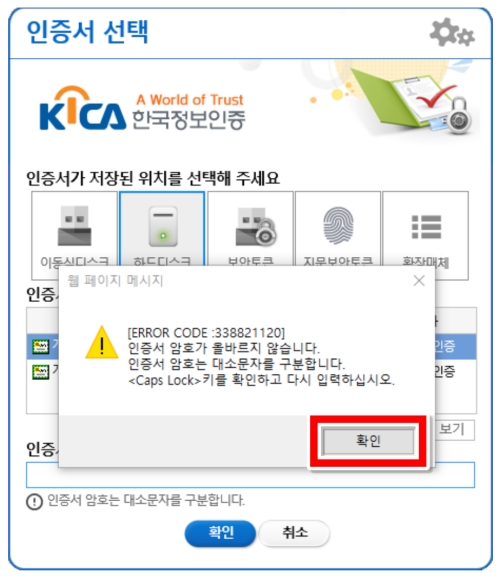 만약 입력한 암호가 틀렸다면, '인증서 암호가 올바르지 않습니다'라는 경고창이 나타날 거예요. Caps Lock 키가 켜져 있지는 않은지 확인하고 다른 추측 암호를 시도해 보세요. 횟수 제한 없이 계속 시도해 볼 수 있어서 좋더라구요.