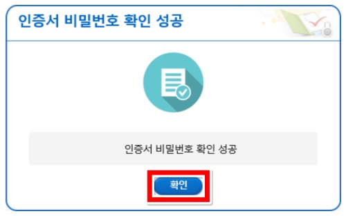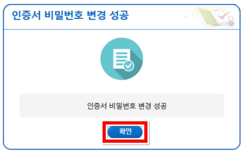 모든 과정을 마치면 '인증서 비밀번호 변경 성공'이라는 화면이 보입니다. 이제 앞으로는 새로 만든 비밀번호로 모든 인증서 관련 업무를 볼 수 있게 된 거예요. 확인을 선택해서 창을 닫아주시면 모든 절차가 끝납니다.