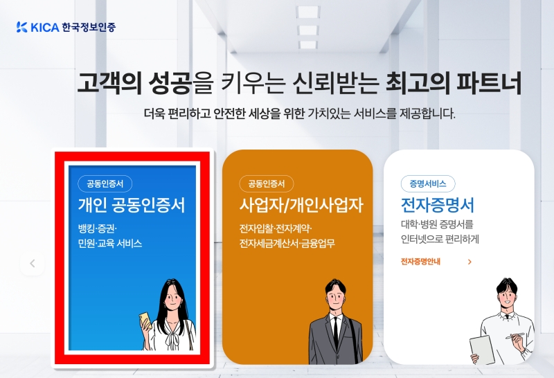 사이트에 접속하면 여러 메뉴가 보이는데요, 우리는 개인용 인증서를 다룰 거니까 왼쪽의 '개인 공동인증서' 부분에 시선을 두시면 됩니다. 여기서 발급, 재발급, 관리 등 개인 인증서에 관한 다양한 일을 처리할 수 있어요.