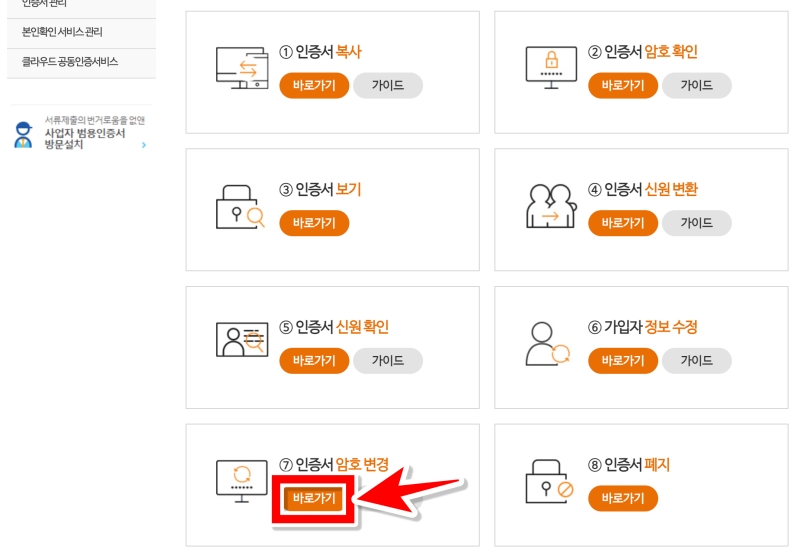 다시 인증서 관리 페이지로 돌아와서, 이번에는 아래쪽에 있는 '⑦ 인증서 암호 변경'의 바로가기 버튼을 선택해 주세요. 방금 확인한 암호를 잊어버리기 전에 바로 변경하는 게 안전하겠죠.