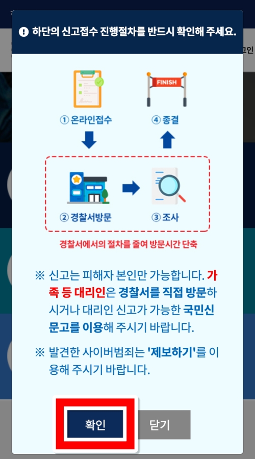 '신고하기'로 들어가면, 먼저 전체적인 진행 절차를 안내하는 창이 나타나요. 여기서 가장 유의해서 봐야 할 부분은 온라인 접수 후에 반드시 직접 경찰서에 방문해야 한다는 점이에요. 온라인으로만 모든 게 끝나는 줄 아는 분들이 많은데, 이건 경찰서 방문 시간을 줄여주는 사전 접수 개념이거든요. 이 내용을 꼼꼼히 읽고 이해했다면 '확인'을 선택해 다음으로 넘어가면 됩니다.