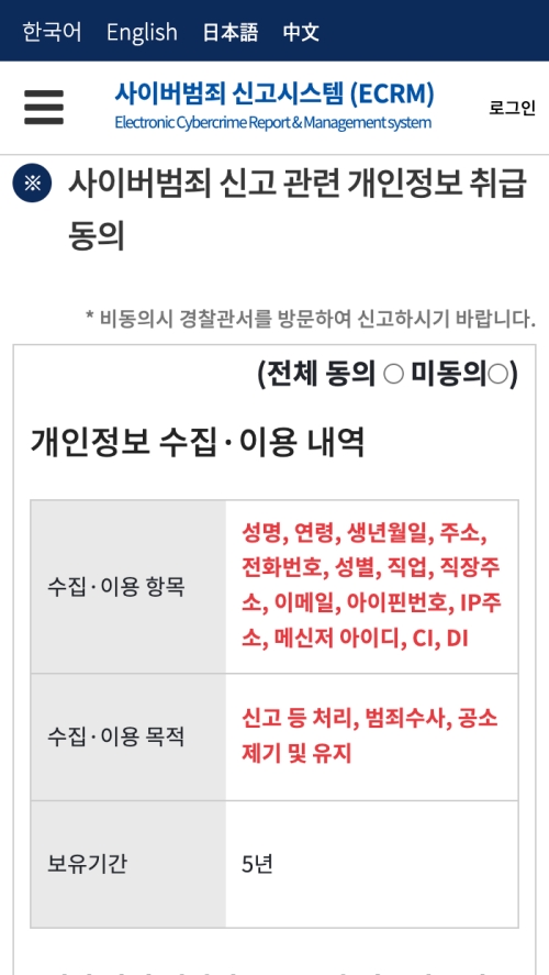 다음 화면은 개인정보 처리에 대한 동의를 받는 부분이에요. 제 이름이나 연락처, 주소 같은 정보들을 수사 과정에서 사용해도 되는지 묻는 건데요. 사건을 처리하려면 당연히 제 정보가 필요하겠죠. 여기서 동의하지 않으면 온라인 접수 자체가 불가능하니, 내용을 확인하신 후에 '전체 동의'를 선택하는 것이 원활한 진행을 위해 좋습니다. 만약 동의하고 싶지 않다면, 직접 경찰서로 가야 해요.