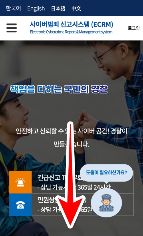 사이트에 들어가면 여러 메뉴가 보이는데, 처음에는 조금 복잡하게 느껴질 수도 있어요. 화면에는 '책임을 다하는 국민의 경찰'이라는 문구와 함께 경찰관 사진이 보이는데요. 여기서 우리가 해야 할 일은 실제 피해 사실을 알리는 것이기 때문에, 다른 메뉴들 사이에서 신고와 관련된 부분을 찾아야 합니다. 화면 중앙에서 아래쪽으로 시선을 옮기면 관련 메뉴들이 나타날 거예요.