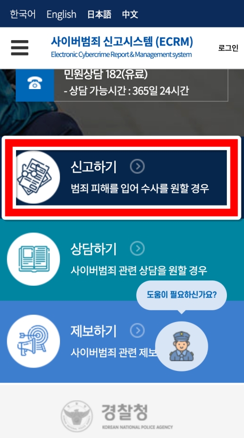 여러 아이콘 중에서 우리는 범죄 피해를 입었고, 이에 대한 수사를 정식으로 원하기 때문에 '신고하기' 항목을 선택해야 해요. 옆에 있는 '상담하기'나 '제보하기'와는 성격이 달라요. 상담은 말 그대로 궁금한 점을 묻는 거고, 제보는 범죄가 의심되는 정황을 알려주는 거라면, 신고는 본인이 직접적인 피해자로서 사건 접수를 요청하는 것이니 헷갈리지 않도록 주의해야 합니다.