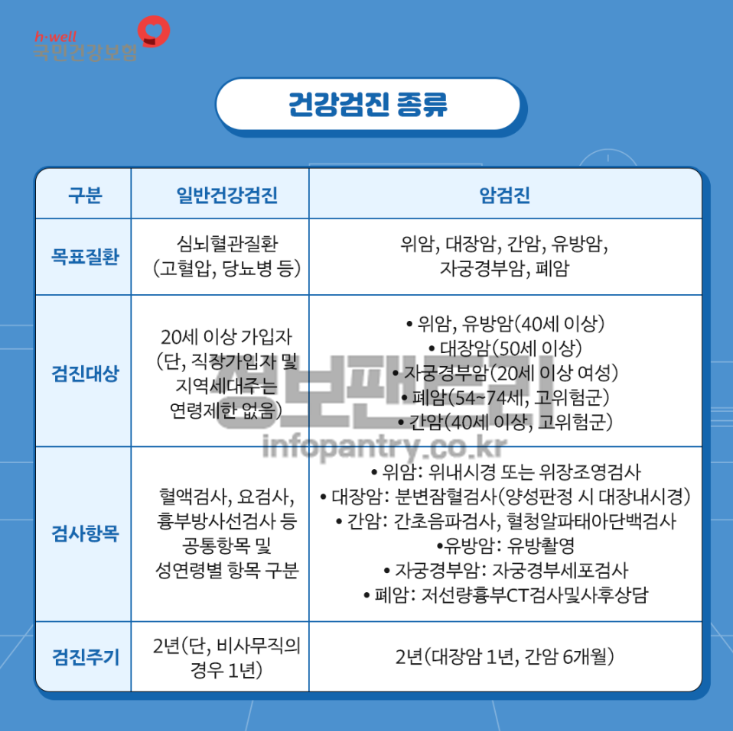 건강검진 검사종류는 일반건강검진과 암검진 두가지로 나뉘어 있답니다. 일반건강검진은 20세 이상이면 받을 수 있지만 암검진은 나이대별로 받을 수 있는 검진종류가 다르니 아래 건강검진 종류 표를 참고해주세요.