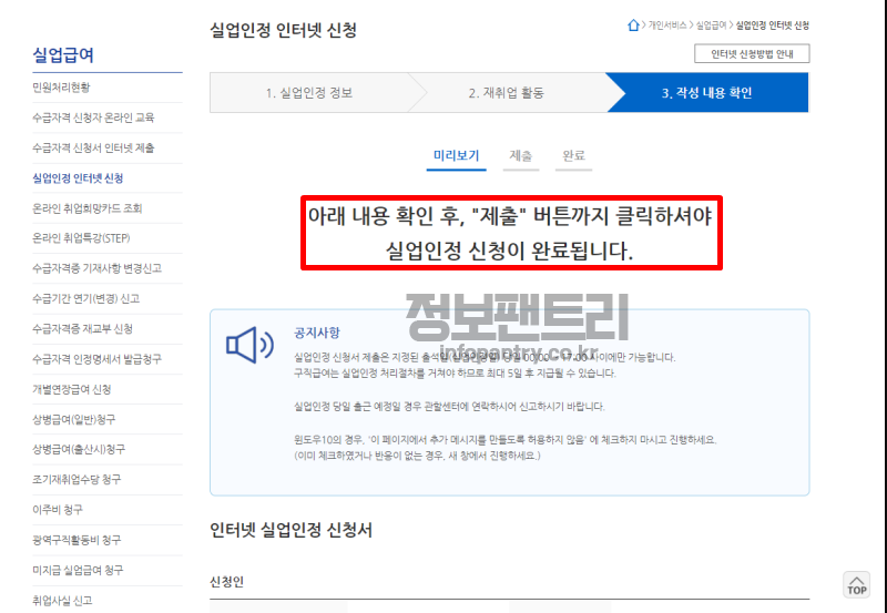 아래 내용 확인 후 제출버튼을 누르면 실업인정 신청이 완료된답니다.