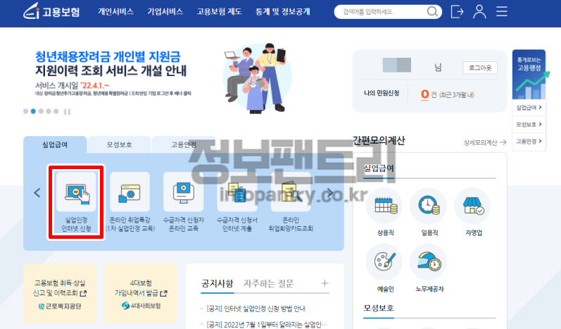 고용노동부에서 운영하는 실업급여 인터넷 신청으로 들어가세요.