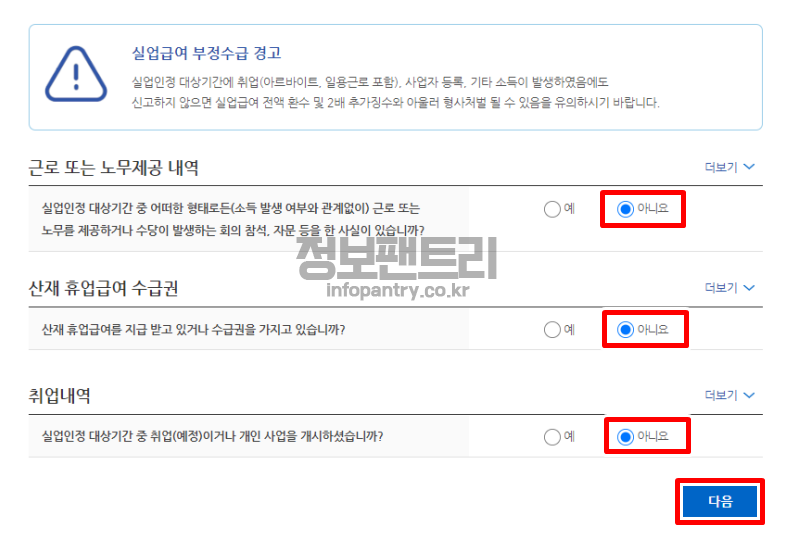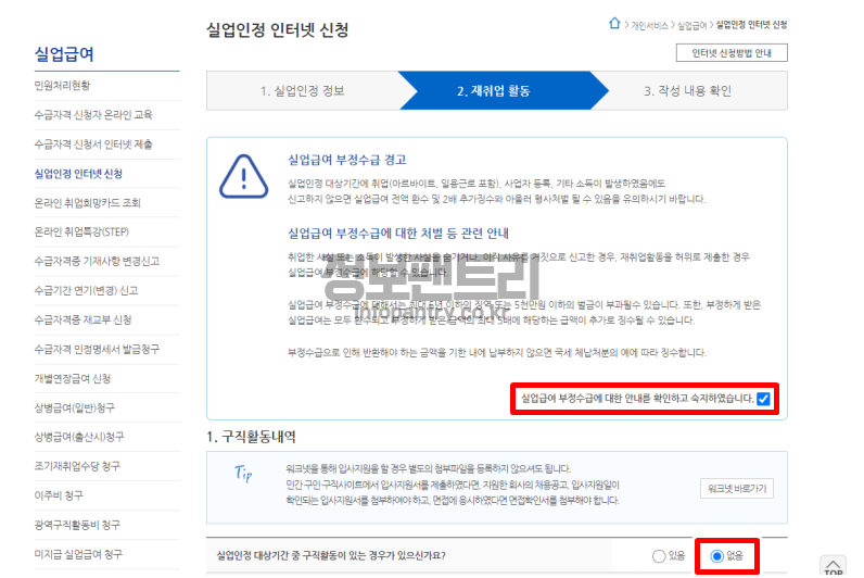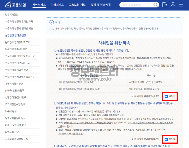 이 후 개인서비스 > 실업인정 인터넷 신청으로 들어가시면 재취업을 위한 약속 동의사항을 체크해주세요.