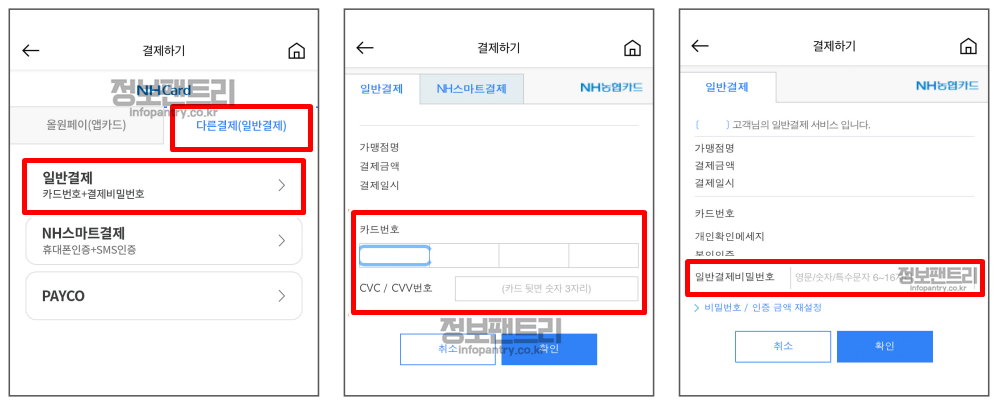 온라인 결제 시 일반결제로 들어가셔서 카드번호와 결제비밀번호를 입력하여 사용합니다.