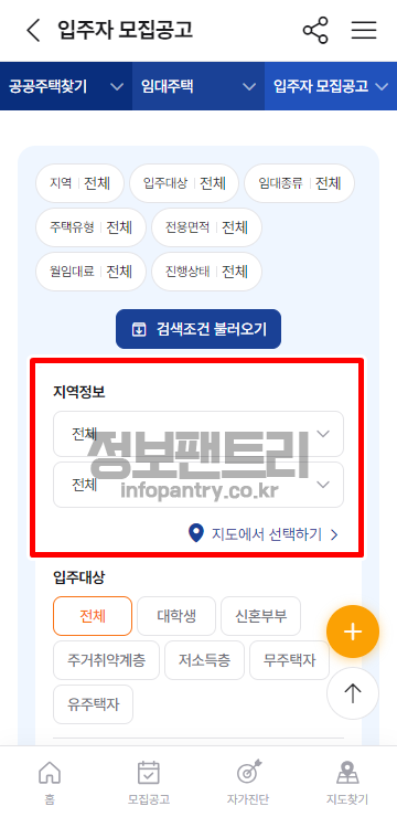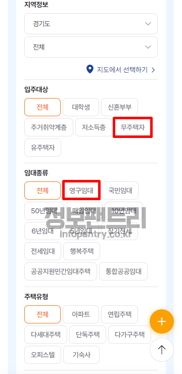 - 입주대상에서 저소득층이신 경우 주거취약계층을 선택해주시고 아닌 경우는 무주택자를 선택하세요.