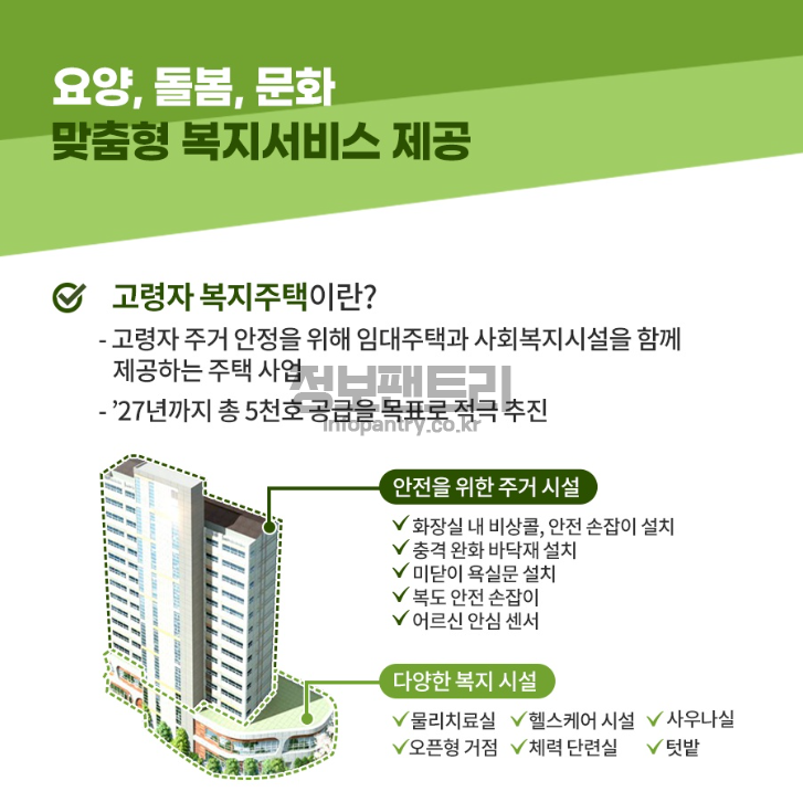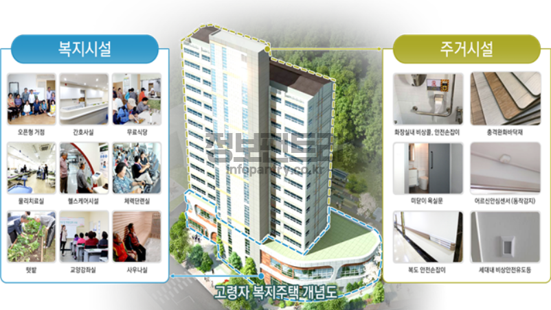 고령자 복지주택은 고령자 주거안정을 위해 임대주택과 주거복지서비스를 함께 제공하는 국가의 주택 사업 입니다. 고령화 인구수가 가장 높은 지역 3곳에 고령자 맞춤형 주거플랫폼을 조성하여 요양, 돌봄, 일자리 등을 제공합니다.