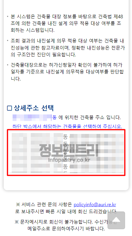 - 조회한 주소에 위치한 건축물의 상세주소 목록입니다. 목록에서 상세주소를 선택해주세요.