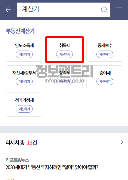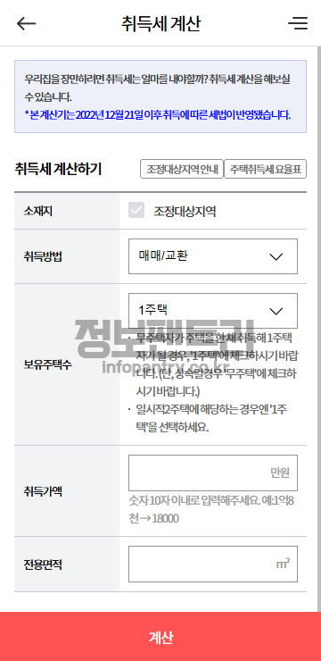 5. 조정대상지역 여부, 취득방법, 보유주택 수, 취득가액, 전용면적을 입력하시고 계산 버튼을 누르면 부동산 취등록세 금액을 알아볼 수 있어요.