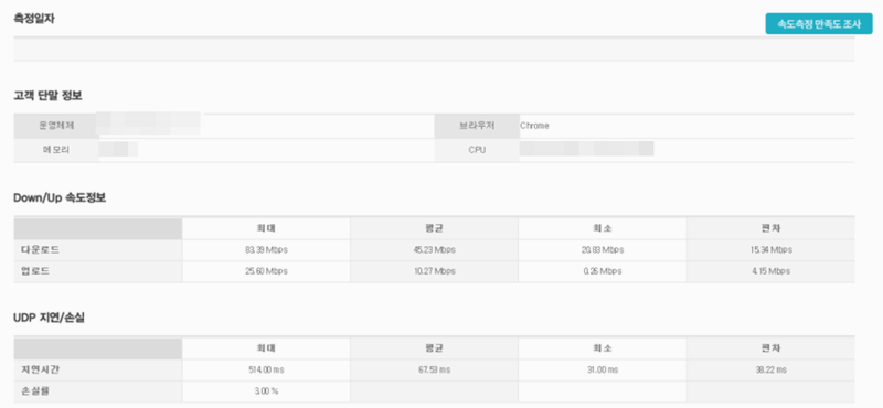 4. 속도 측정이 완료되면 결과가 표 형식으로 제공됩니다. 이 표에는 최대 속도, 평균 속도, 최소 속도가 모두 표시되며 인터넷 속도가 어떻게 변동하는지 한눈에 확인할 수 있습니다. 또한 UDP 통신의 패킷 손실률까지 확인할 수 있어 인터넷 연결에 문제가 있을 경우 더 자세히 분석할 수 있습니다. 이런 세부 정보를 통해 네트워크 상태를 더 정확하게 파악하고 문제 해결에 도움이 됩니다.