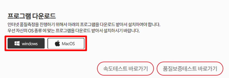 2. 인터넷 속도 측정은 메가급, 기가급, 10G 광속 테스트로 나뉘며 가입한 속도에 맞춰 결과가 달라집니다. 모든 통신사에서 동일한 방식으로 측정되니 결과를 참고하면 됩니다. 테스트를 위해서는 프로그램 설치가 필요하며 윈도우나 MacOS에 맞는 프로그램을 설치한 후 정상적으로 속도 측정이 가능합니다.