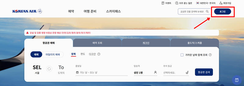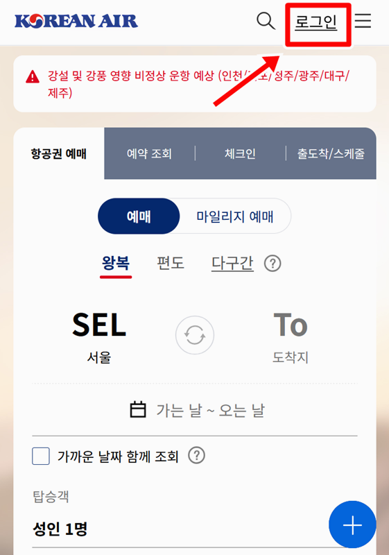 1. 가장 먼저 대한항공 공식 홈페이지에 접속하셔야 합니다. PC와 모바일 모두 지원하며 저는 모바일에서 진행했지만 PC로도 동일하게 이용하실 수 있습니다. 편한 기기를 선택해 접속을 시작해 보세요. 접속하셨다면 화면 우측 상단에 위치한 로그인 버튼을 선택해주세요.