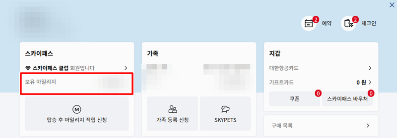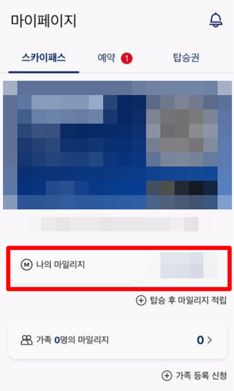 5. 로그인 후 마이페이지에서 스카이패스 정보를 확인할 수 있는데요. 이를 통해 남아 있는 마일리지를 상세하게 확인하실 수 있습니다. 가족 합산 마일리지도 보입니다.
