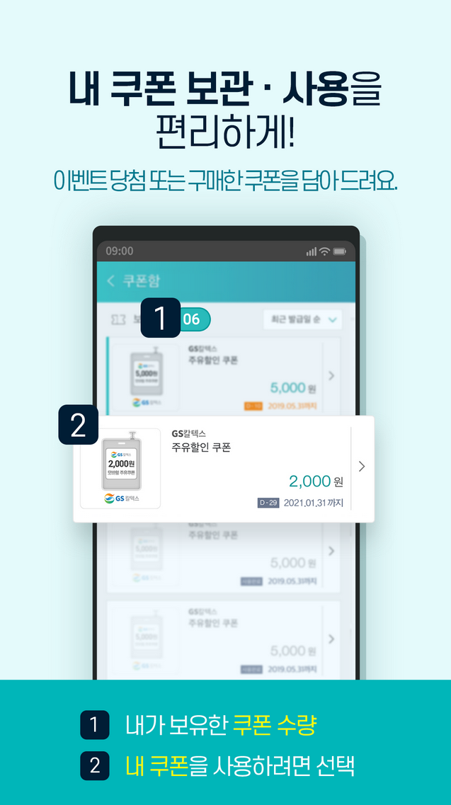 4. 이벤트로 받은 쿠폰이나 구매한 쿠폰은 별도의 저장 공간에 보관됩니다. 보유한 쿠폰의 수량을 확인할 수 있고 사용하려는 쿠폰은 선택하여 이용 가능합니다.