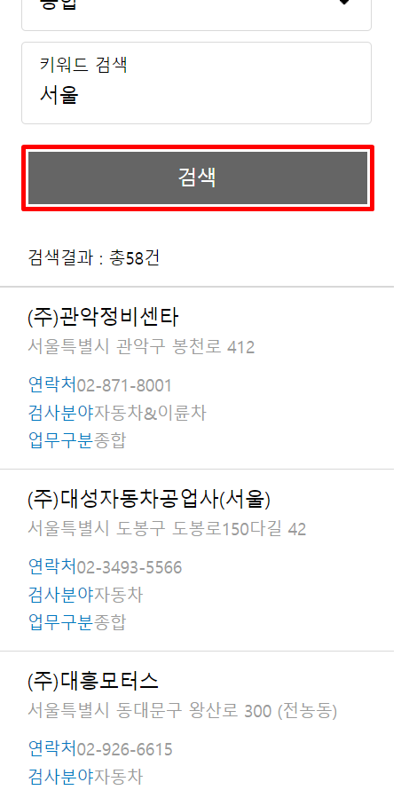 5. 마지막으로 키워드 입력 후 검색버튼을 누르면 민간 자동차 검사소 목록을 확인할 수 있어요. 검사소의 상세주소, 연락처, 검사분야와 업무구분을 확인해보시고 연락하여 방문하시기 바랍니다. 😎✌️