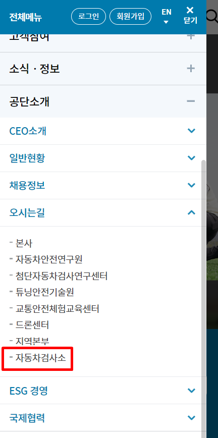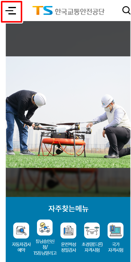 1. TS한국교통안전공단으로 들어가 왼쪽 상단에 메뉴 아이콘을 열어보세요.