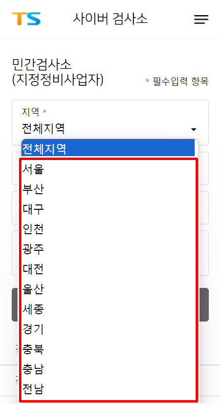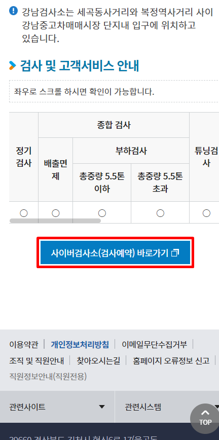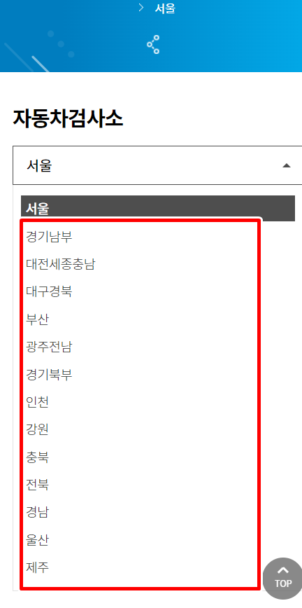 5. 자동차 검사소 위치를 지역별로 알아볼 수 있는데요, 지역 메뉴창을 선택해보세요.